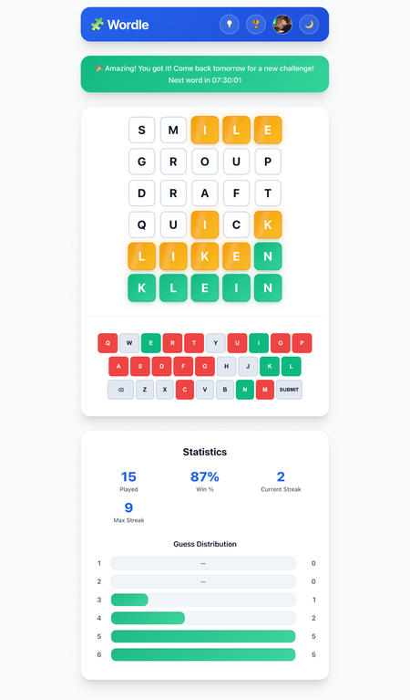 - End-of-Game Statistics: Metrics like games played, current streak, win percentage, and guess distribution.