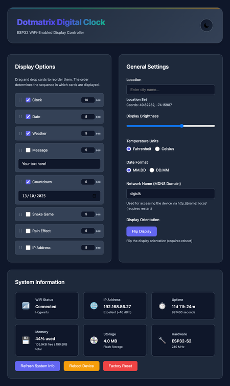 - System Features: MDNS configuration, timezone/weather via Open-Meteo API, system info, reboot/factory reset